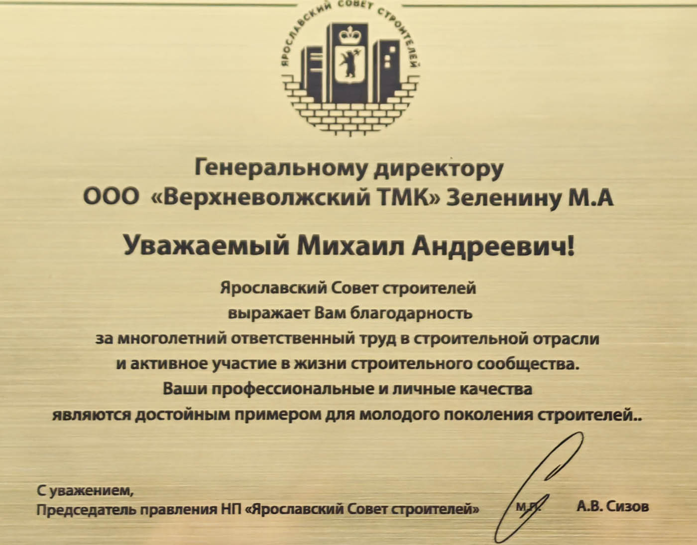 Ярославский Совет строителей отметил вклад генерального директора ООО «Верхневолжский ТМК»