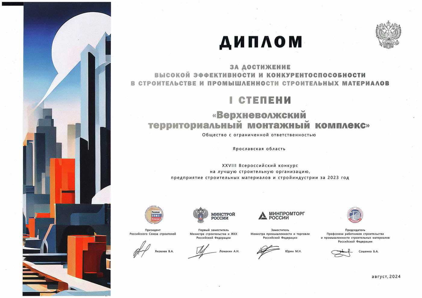 В 2023 году ООО «Верхневолжский ТМК» завоевало диплом I степени на 28 Всероссийском конкурсе, подтвердив высокую эффективность и конкурентоспособность в строительстве. Это признание – результат работы всего коллектива, направленной на совершенствование процессов и внедрение инноваций.